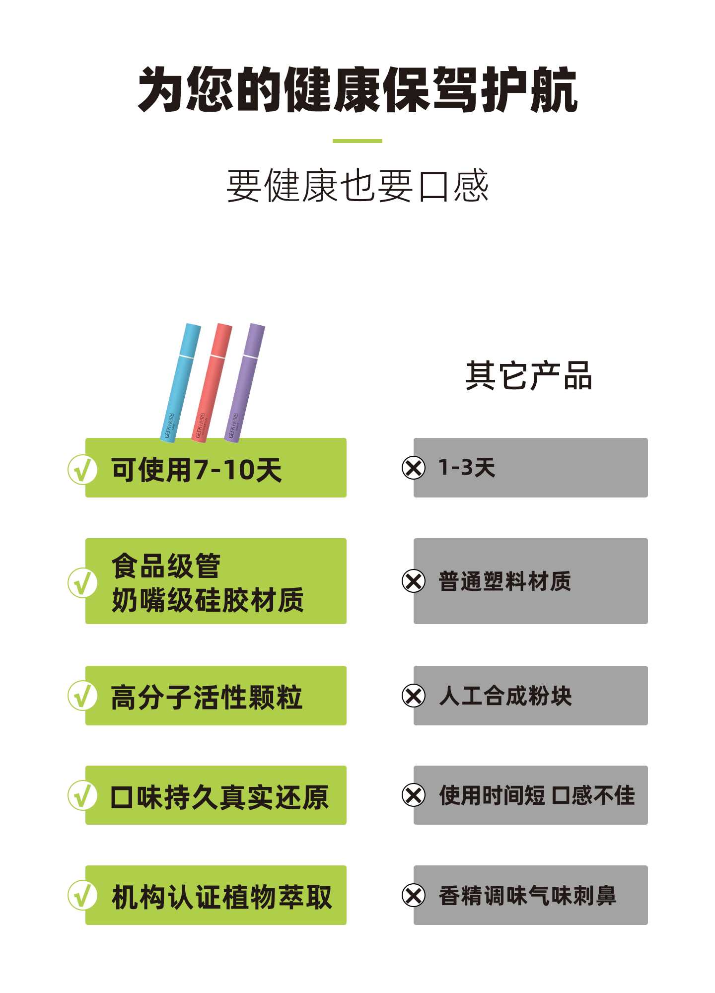 極客草本龍井果味棒,戒煙人群的天然草本優選替代。嚴選龍井茶葉及純植物草本原料,萃取茶多酚、氨基酸等天然活性成分,無尼古丁、焦油等有害添加,守護呼吸道健康,減少煙草傷害。